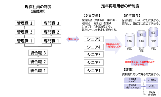 支援では、経営視点・再雇用者視点・現役社員視点の3つから制度設計の前提と考え方を整理し、ディスカッションを重ねながら制度骨子(制度概要/人材区分/評価制度/給与制度)を策定しました。中核としたのは、現役世代の等級体系から切り離した再雇用向けジョブ体系の導入です。(図)
