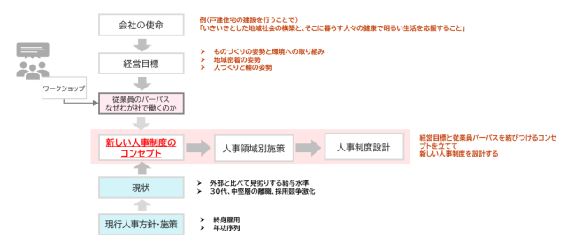 まず、ドキュメント分析(規程・給与テーブル・評価シート・会議体資料等)、経営層ヒアリング、定量分析を通じて現状の問題認識を整理し、論点を「処遇競争力」「役割・昇格の基準」「評価・育成の運用力」に絞り込みました。並行して全社員ワークショップを実施し、会社の使命→経営目標→従業員パーパスを順に言語化しました。たとえば「地域の暮らしを支える住宅づくり」「ものづくりの姿勢」「顧客・地域との向き合い方」といった価値観を掘り下げ、現場の言葉で“会社らしさ”を整理しました。